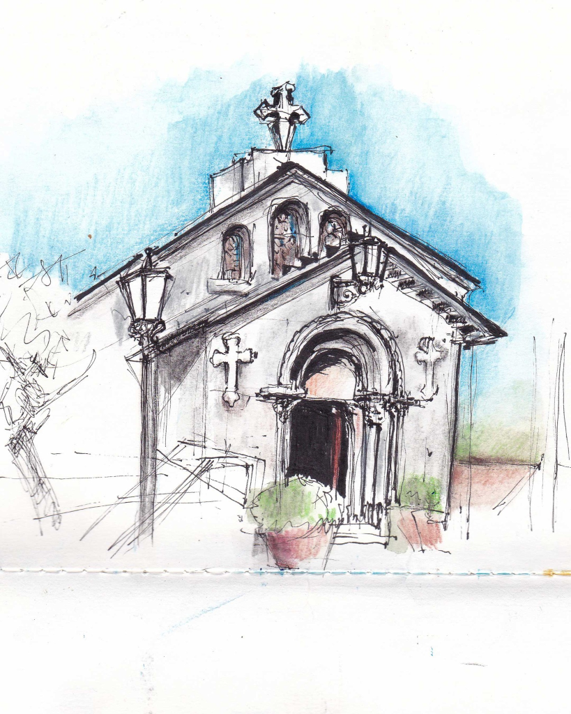 A few streets over is the Church of Santaia de Arca. Next to it, there’s a grassy area and some plastic chairs in self-service mode, which made it possible to enjoy the sun while working on this drawing.